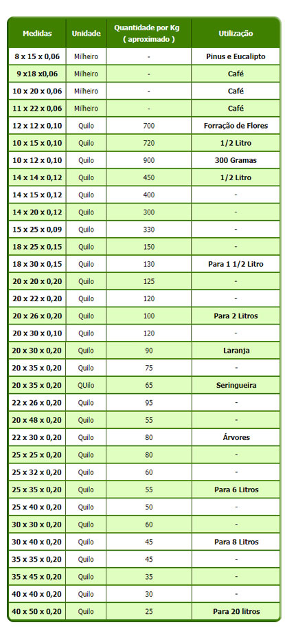 Confira a tabela com os nossos modelos de saquinhos de mudas;